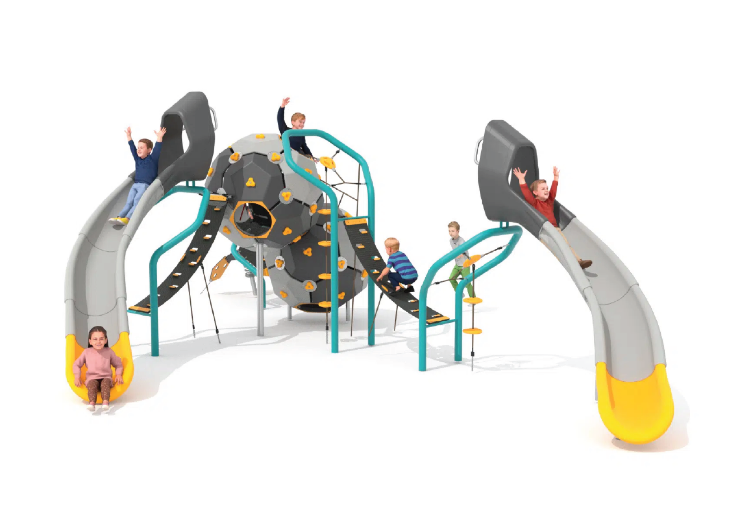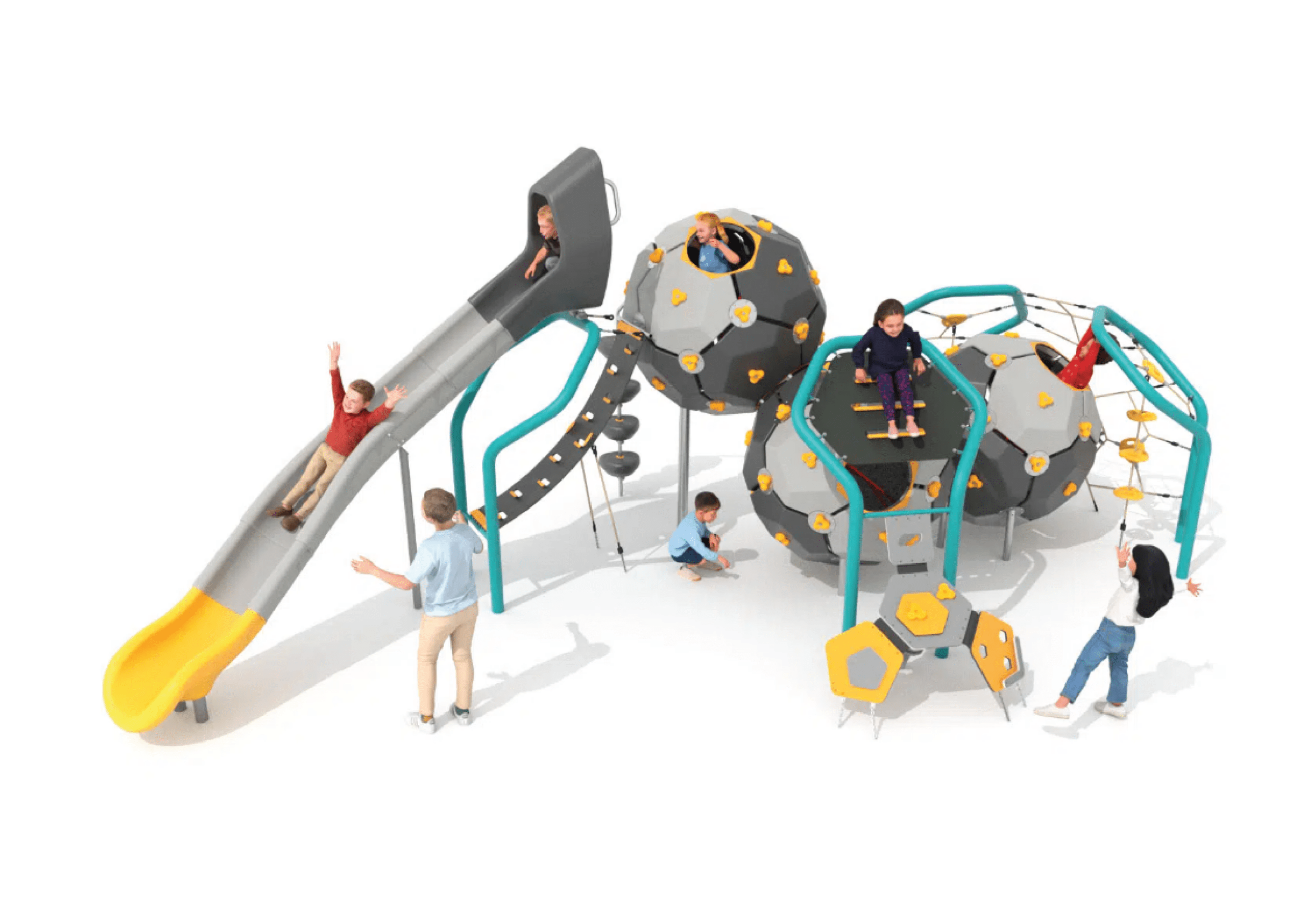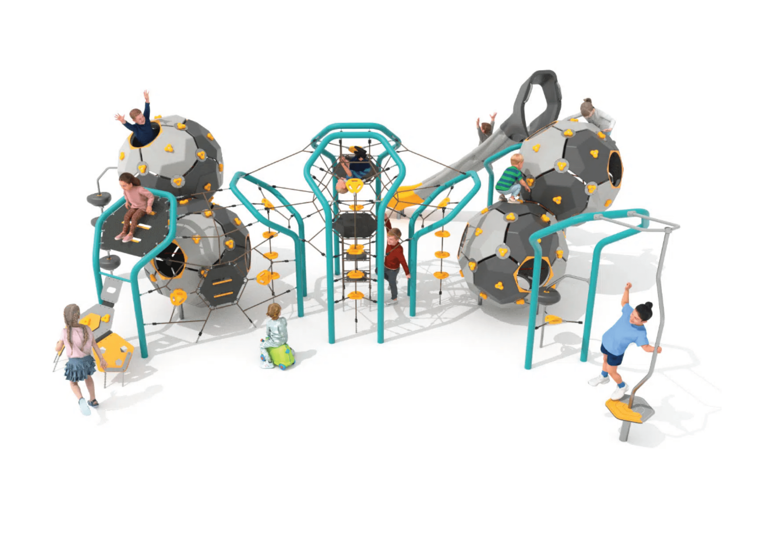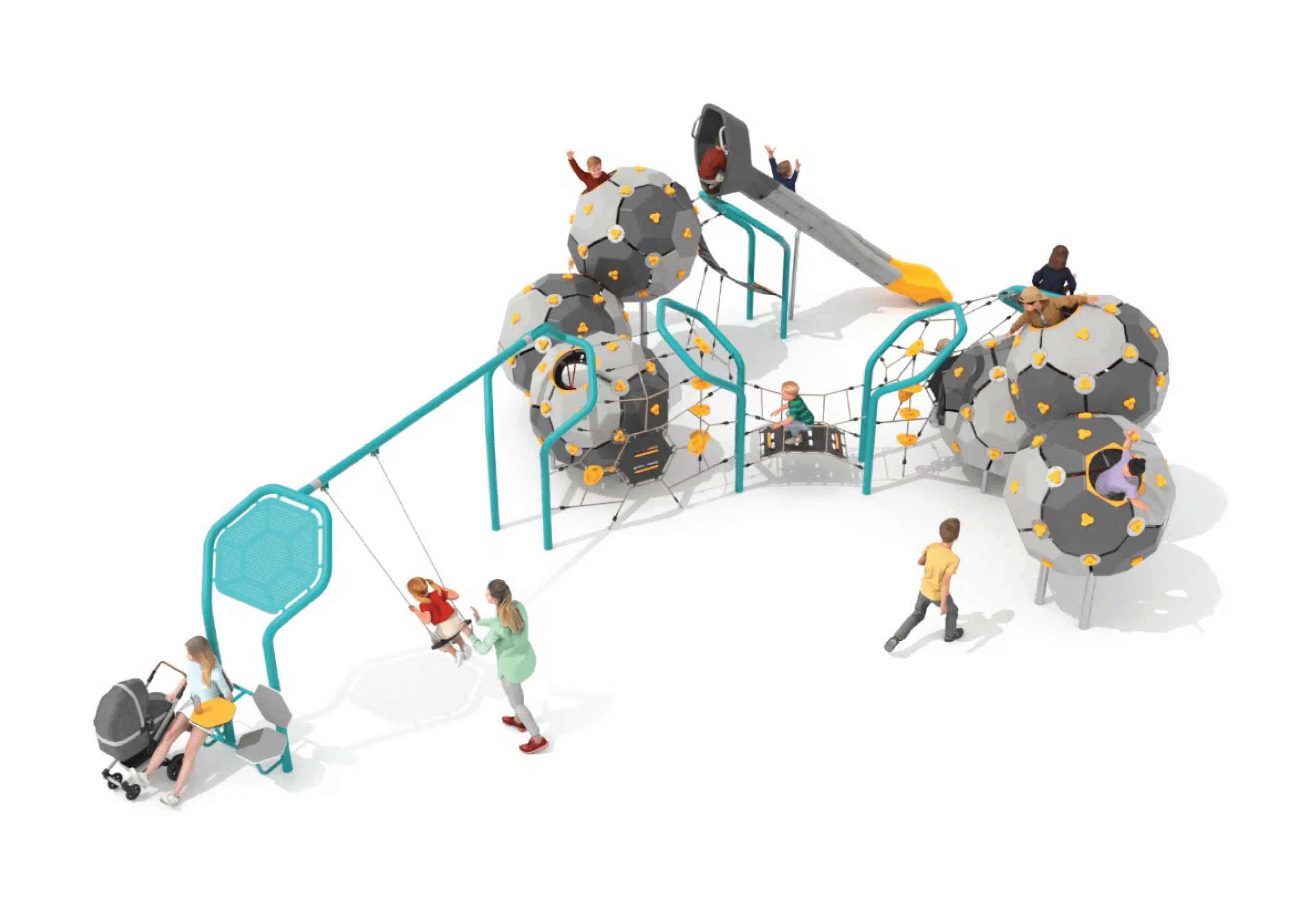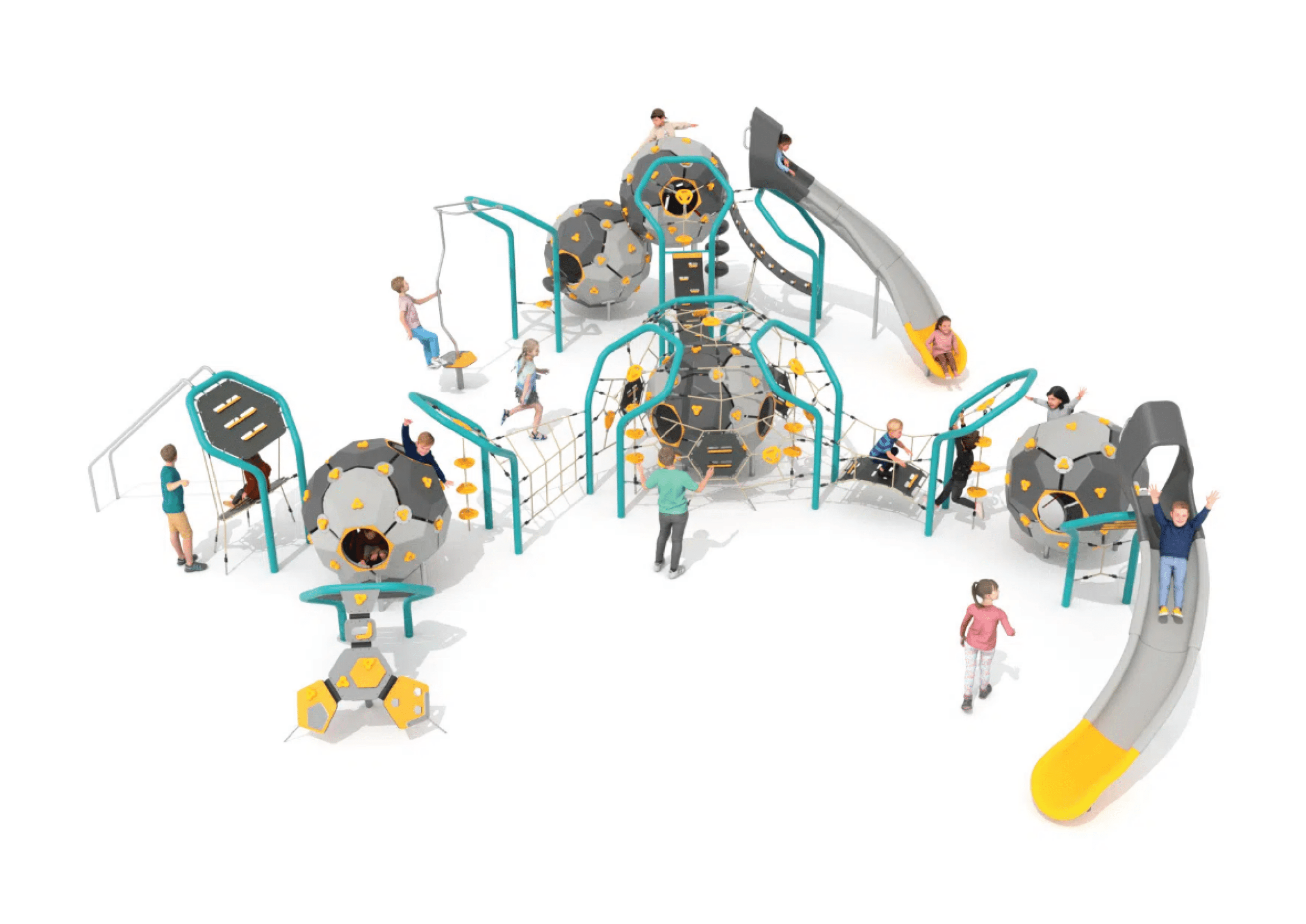 Taking play to a molecular level – the Atomic Bubbles resemble connected atoms, forming seamless, flowing structures that guide children from one activity to the next, maintaining a rhythm of play and exploration. The range encourages climbing, balancing and swinging, supporting coordination and confidence, and creating an engaging environment that invites scientific curiosity.