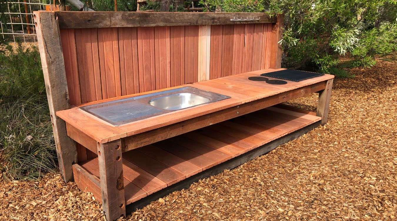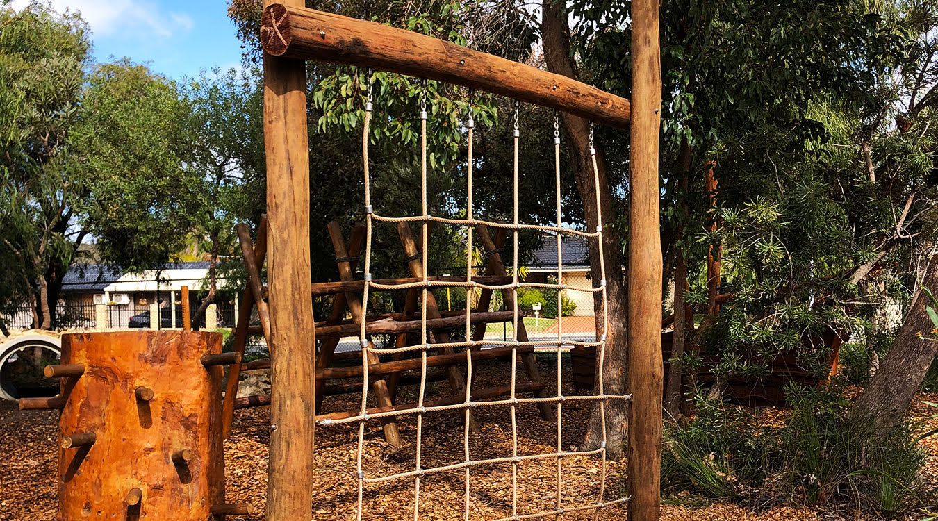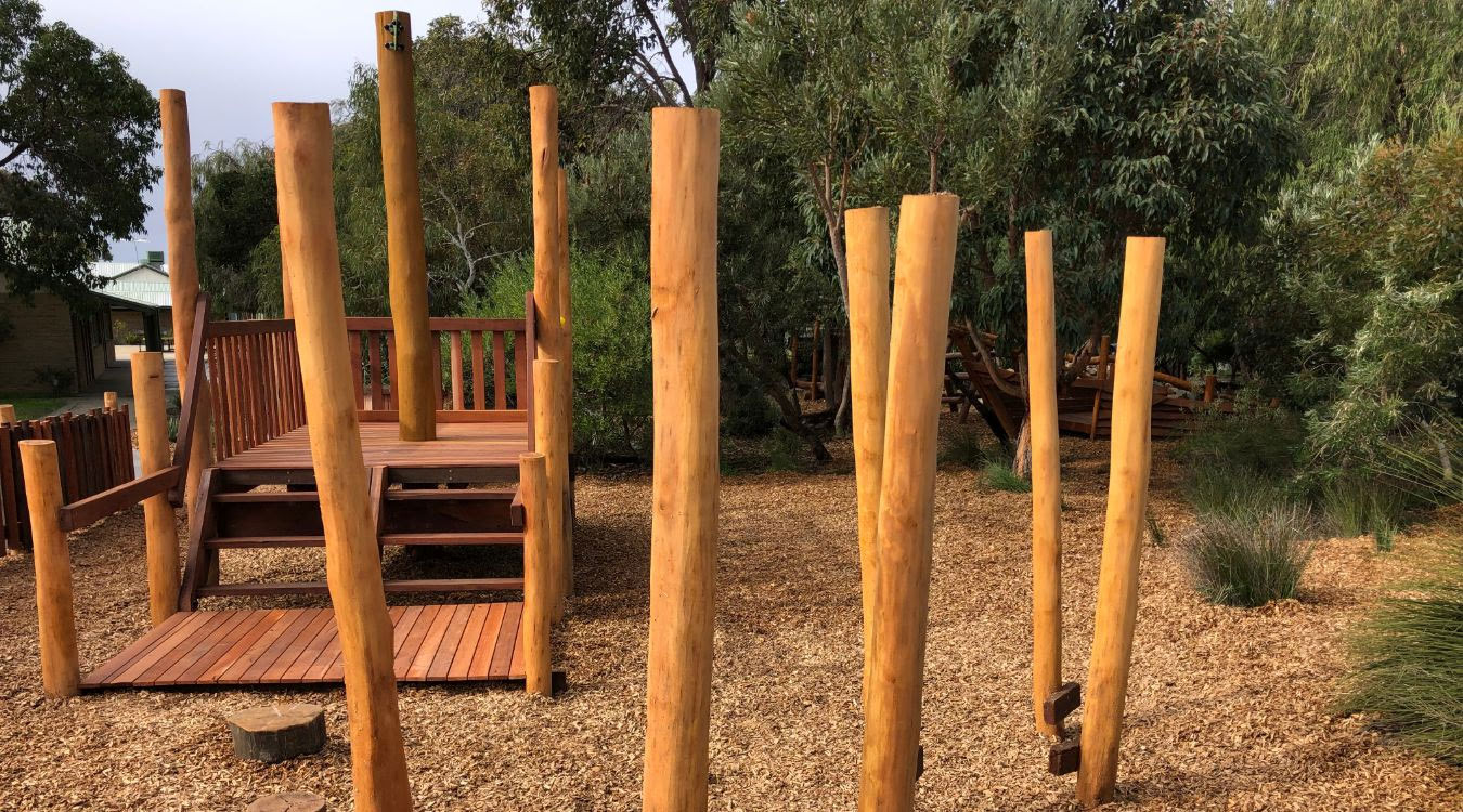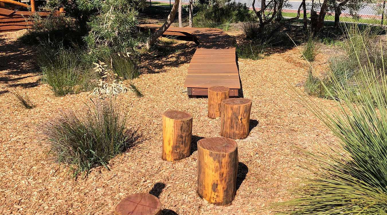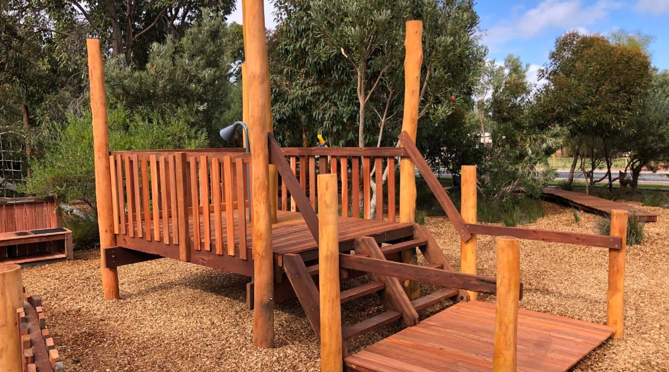 Our brief for this project was to extend the existing nature play area with specific features such as a Mud Kitchen, a boardwalk winding through the trees, timber trail including steppers, balance beams and a climbing net, timber feature fence as well as a central custom fort with a lookout and talk tubes. This area is a buzz of activity at play time and feedback from the students and staff at Alinjarra Primary School has been very positive.