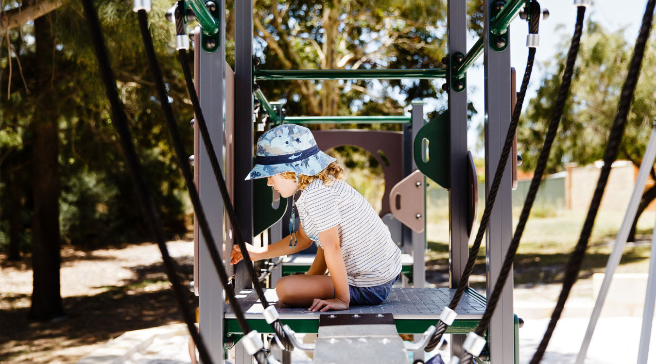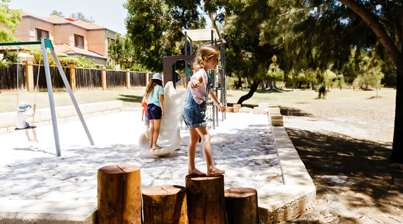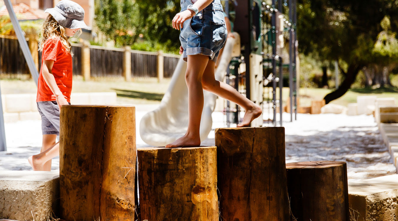 Tucked away in shady suburbia you’ll find this lovely nature-inspired play space enclosed in beautiful and durable limestone and broken up with Jarrah Log Steppers. The Play Park Combo Unit provides ample opportunities to enhance upper body strength and coordination through climbing, whilst the steppers are a fun way to test your balancing skills.