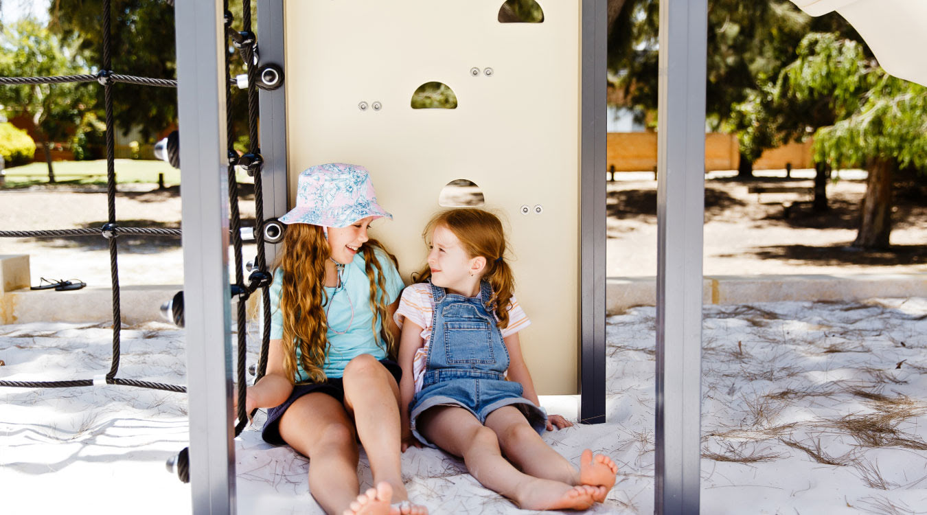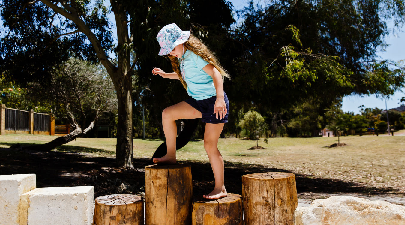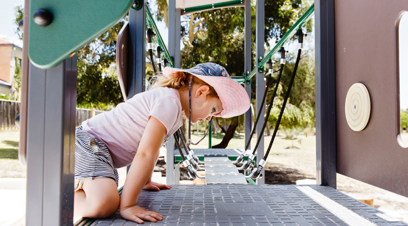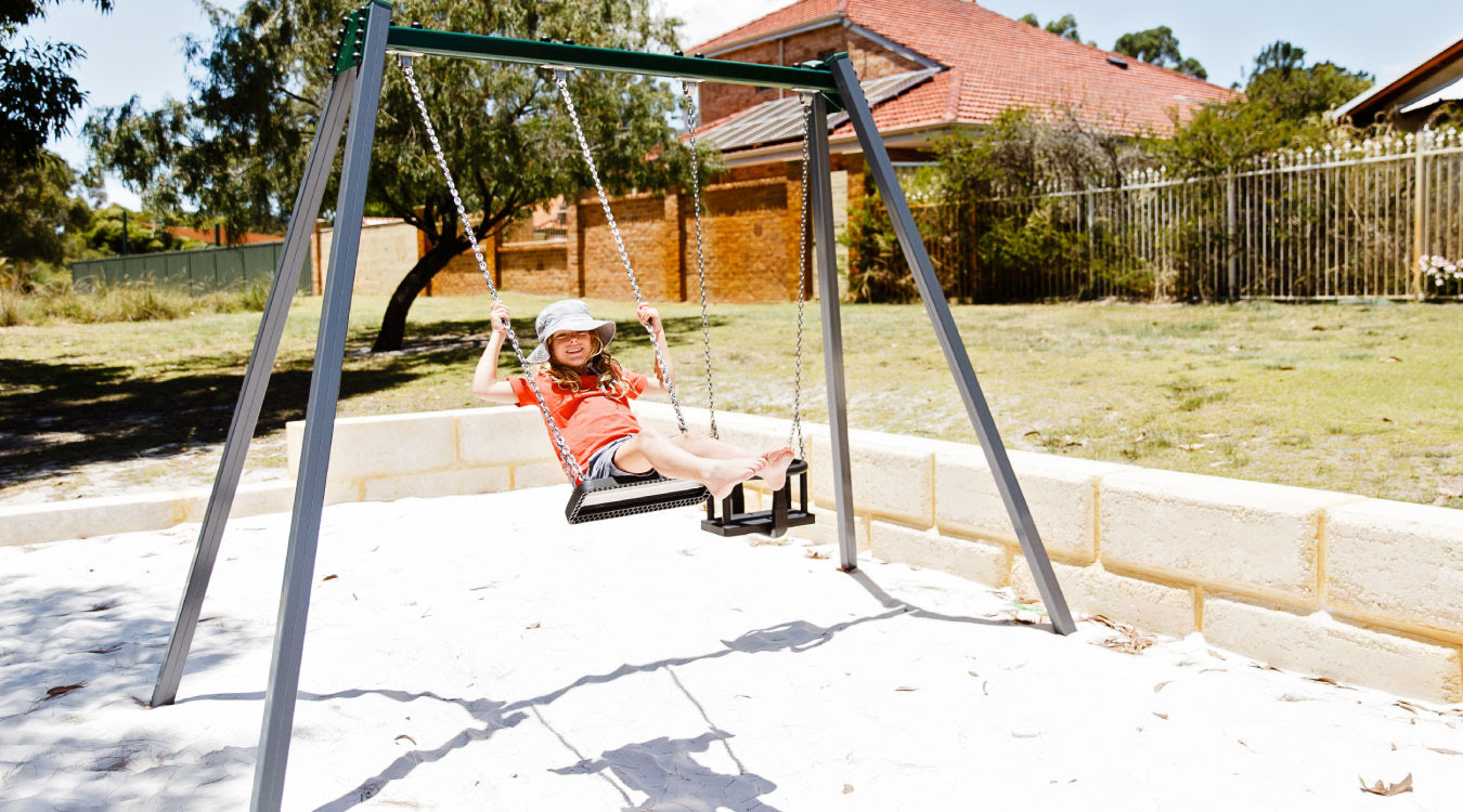 Tucked away in shady suburbia you’ll find this lovely nature-inspired play space enclosed in beautiful and durable limestone and broken up with Jarrah Log Steppers. The Play Park Combo Unit provides ample opportunities to enhance upper body strength and coordination through climbing, whilst the steppers are a fun way to test your balancing skills.