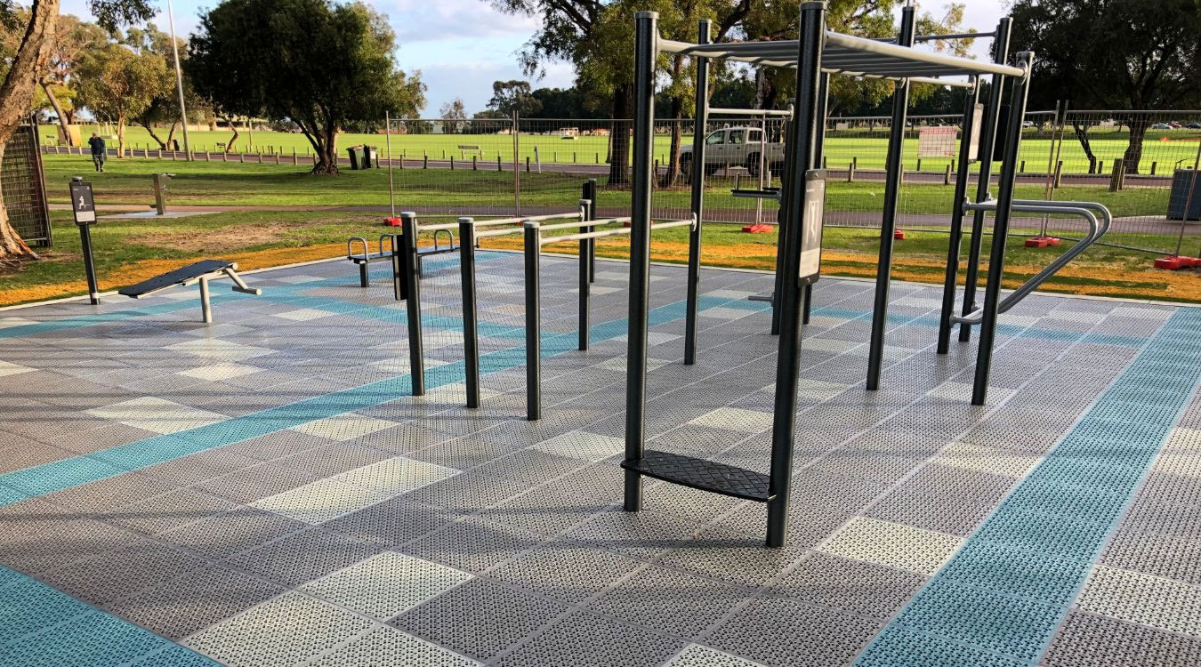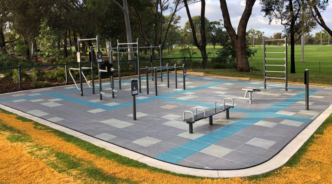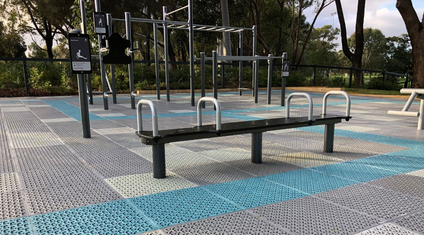 Active Discovery worked closely with the City of Wanneroo and Members of the Perth Calisthenics Community to build this Calisthenics inspired street workout project. An enthusiastic Calisthenics’ member started a request to the Mayor of the City of Wanneroo around having more facilities such as this one around the area and was successful in attaining approval for it to be built. The Parkour inspired design offers a free-flowing zone to inspire and motivate effective training solutions for all fitness abilities. The use of Overhead bars, Chin ups, Roman Rings, Swedish Wall and multi-functional seat provides the Calisthenics inspired users with a highly engaging and challenging work out space. Play Matta was specified into this project and the use of the light blue and grey tiles work well with this design offering a circuit pattern. The surfacing is a fully compliant unitary surface with impact attenuation to over 2.9m FHOF. Play Matta is a 98% recycled product, an environmentally responsible and sustainable choice.