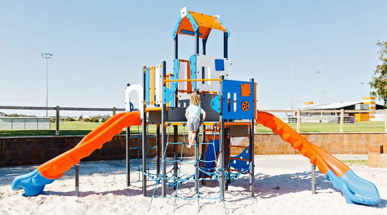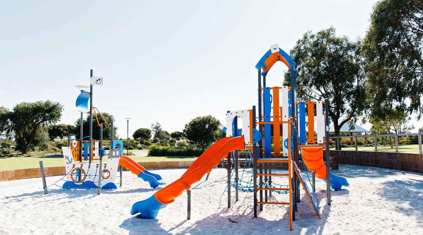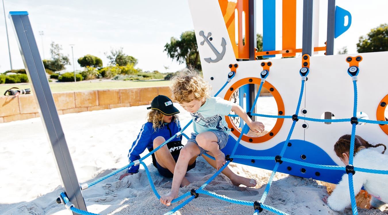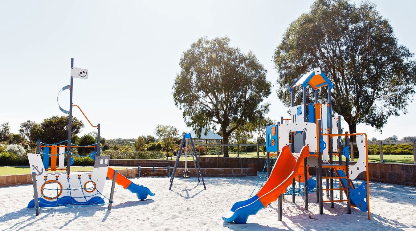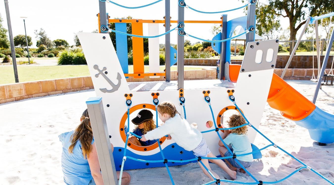 Larkhill Park was a design and construct project that formed part of the City of Rockingham’s 2018/19 Playground Asset Renewal Program. The brief for this project was to include multi combination units and a swing set. We opted to design a nautical theme inspired play space, with the park located in coastal location within a state-of-the-art sporting complex. Captains of all ages can set sail across a sea of imagination between the two play units. The main structure has upper and lower decks with rope nets situated under the decks of the play equipment to simulate sleeping hammocks which will encourage hours of social play. Little sailor mates can make their way onboard the Junior FTA-027 sailor’s boat via a climbing net and stairs, where they can engage in social play, role play and dramatic play. The unit also has integrated port holes allowing sailing adventurers to gaze out to sea while their deck mates steer the little boat to dry land. Other elements of the playground include a double bay swing equipped with a toddler and junior swing seat.