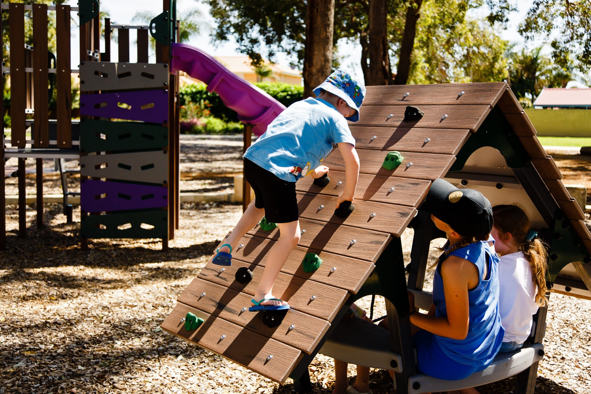 We bought this play space to life using organic composite materials and timber effect powder coated uprights all creating the uniqueness of our Treehouse Range which offers varied opportunities for climbing, swinging, balancing, and discovering. The play equipment chosen for this project was designed to encourage social, physical, and emotional development with interactive Australian wildlife themed play panels, a bright purple slide, as well as some natural log steppers and our play hut.