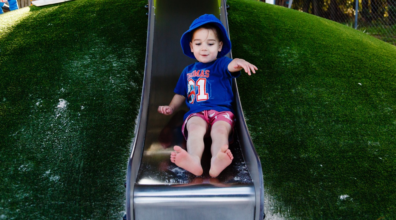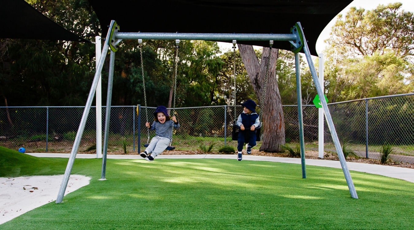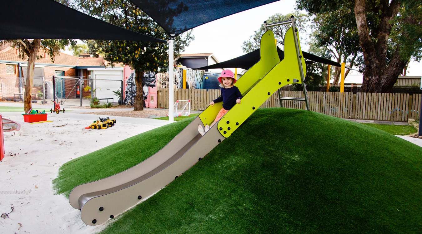 Milligan House Child Care Centre is simply bursting with fun and adventure, combining classic play equipment with elements of music and nature to engage mind, body and spirit! The beautiful Diabolo Adventure Multiplay Unit offers climbing, sliding and imaginative-play opportunities and is flanked by a set of colourful Calypso Chimes. A grassy embankment with slide is centre stage, surrounded by a bike track that traverses the entire space. Also featuring a pod swing, toddler and standard swing seats, springers for those who like to rock and a set of monkey bars for the bigger kids! A nature play area with beautiful wooden play elements rounds out this wonderfully engaging space.