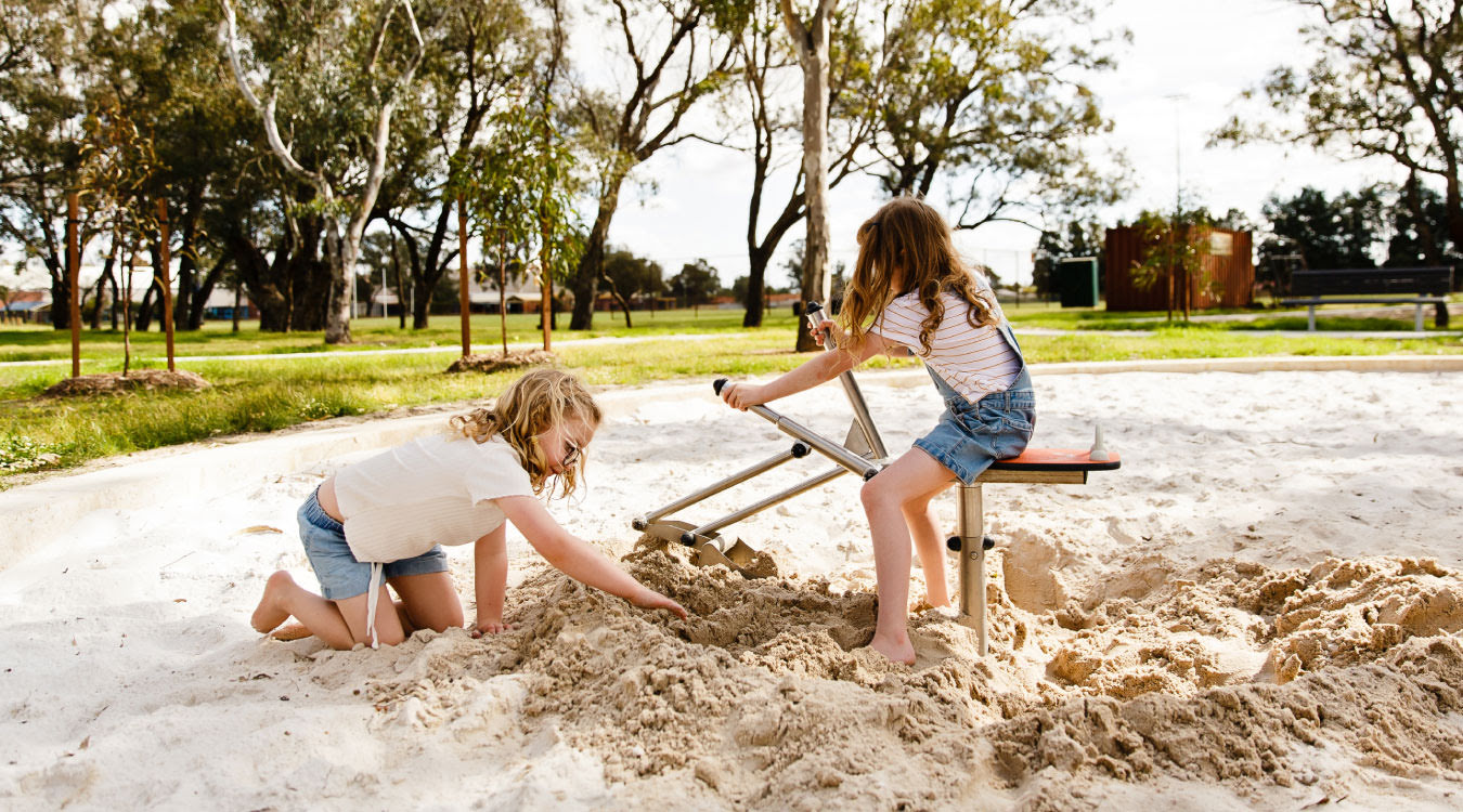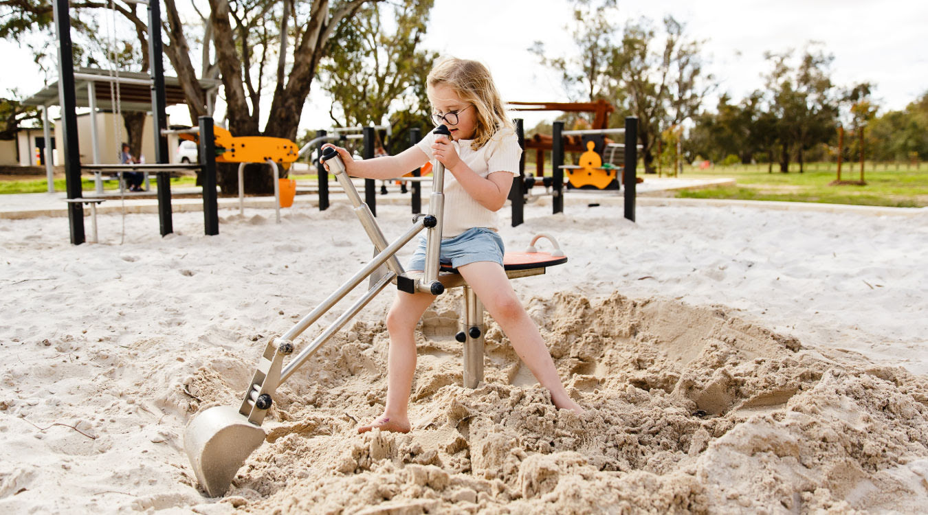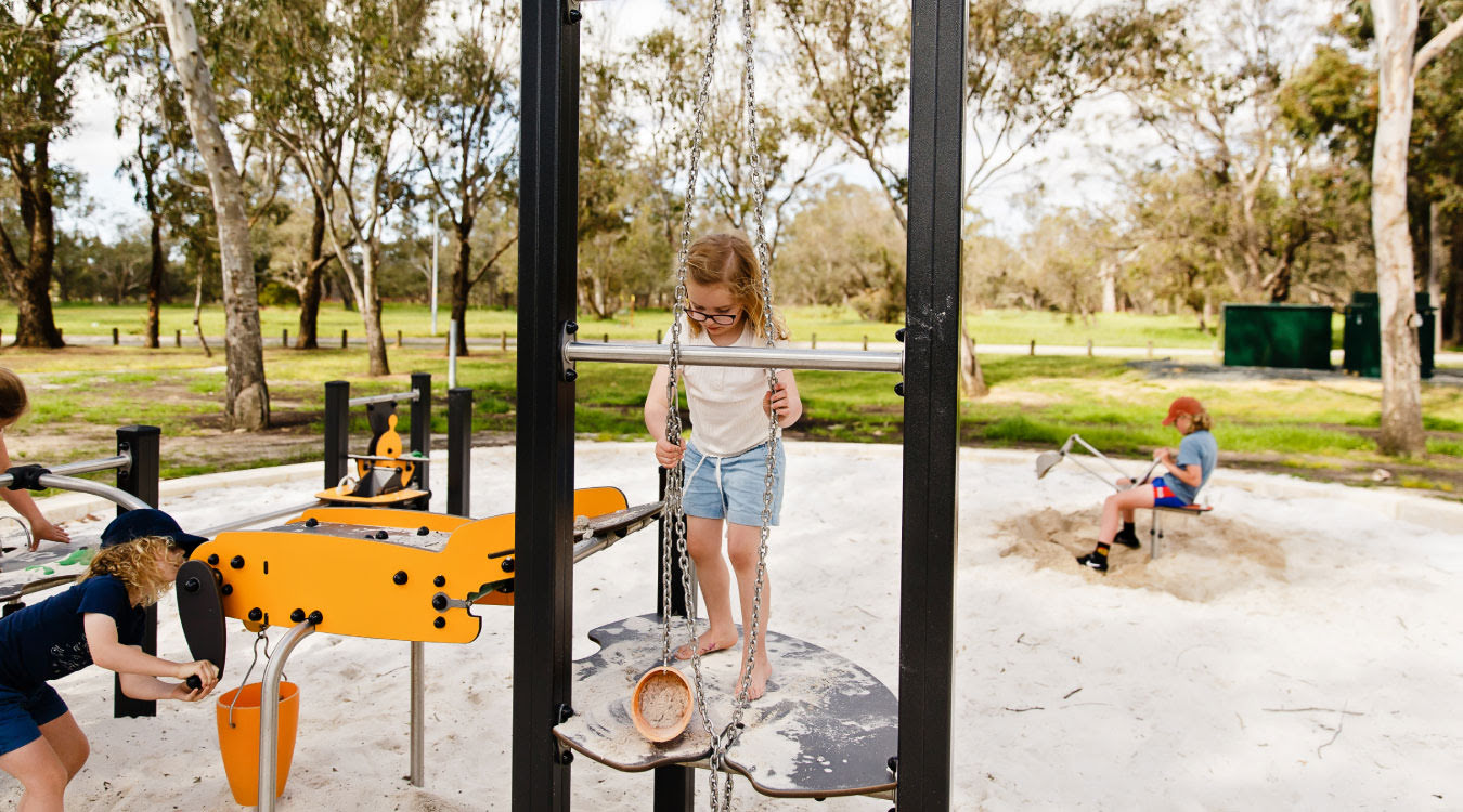 A sensory delight, this playspace under the shade of beautiful establish eucalypts, provides tactile opportunities through the inclusion of the award winning sand factory. Pull, turn, push, sieve, slide and pour sand through the variety of components on this unit to explore the magic of sand play. Hand-Eye Coordination skills can be further developed through the use of the digger in a play-based setting that is sure to keep busy fingers and hands very content. Enjoy swinging in the natural shade and take in the calming atmosphere of this great little park.