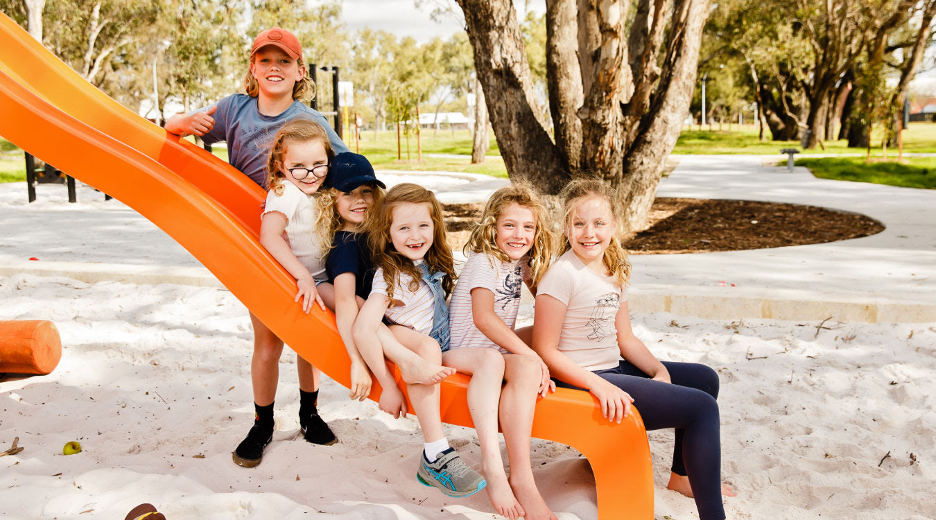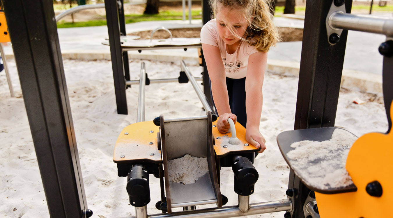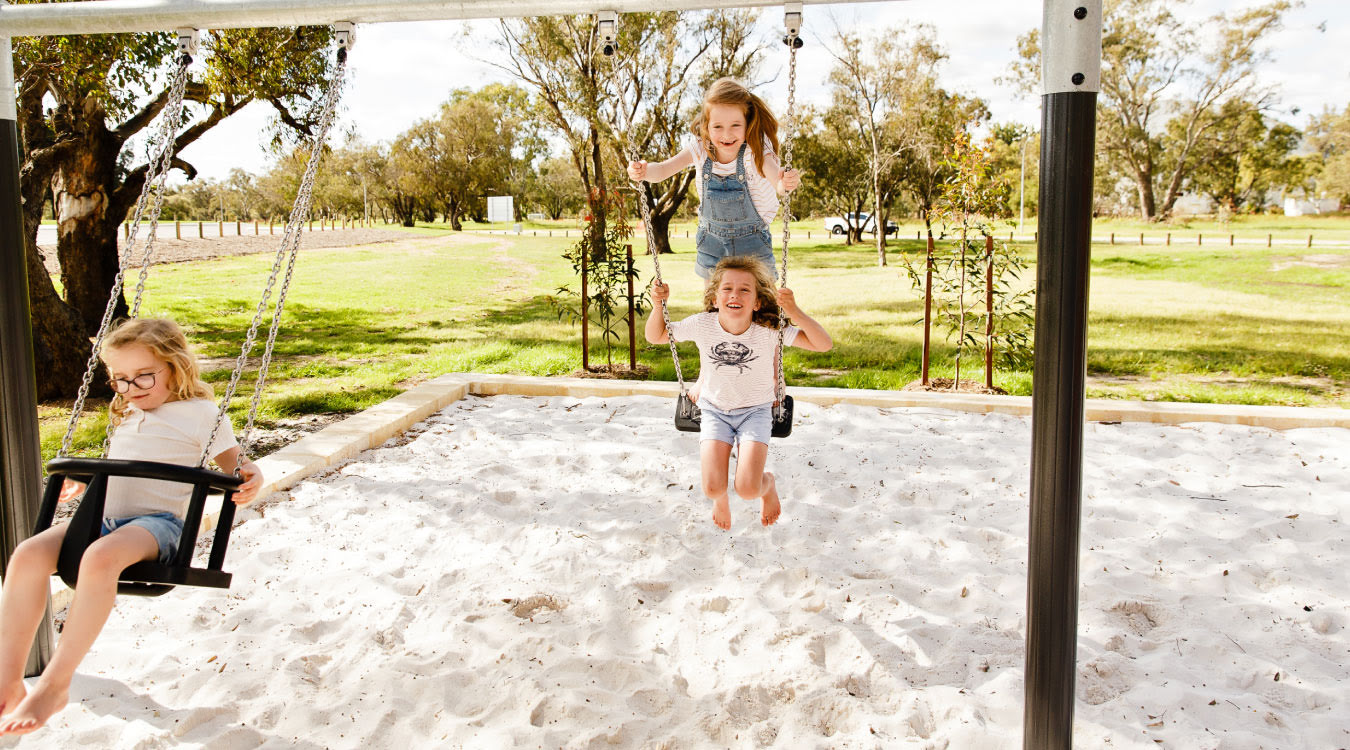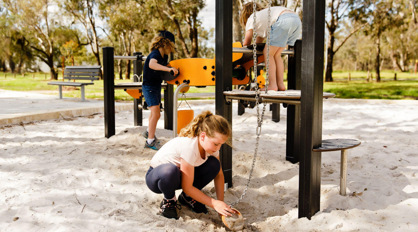 A sensory delight, this playspace under the shade of beautiful establish eucalypts, provides tactile opportunities through the inclusion of the award winning sand factory. Pull, turn, push, sieve, slide and pour sand through the variety of components on this unit to explore the magic of sand play. Hand-Eye Coordination skills can be further developed through the use of the digger in a play-based setting that is sure to keep busy fingers and hands very content. Enjoy swinging in the natural shade and take in the calming atmosphere of this great little park.