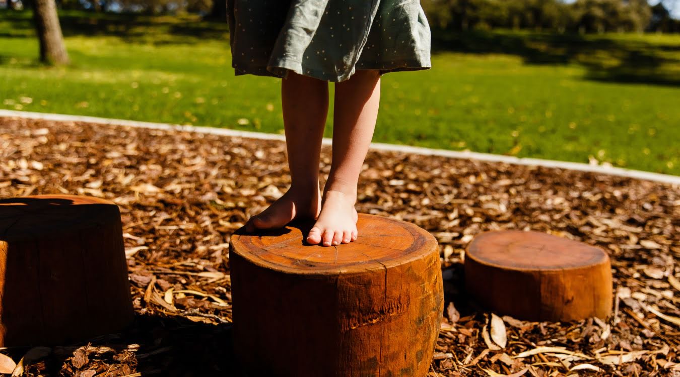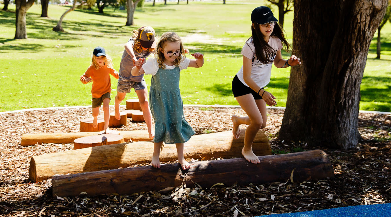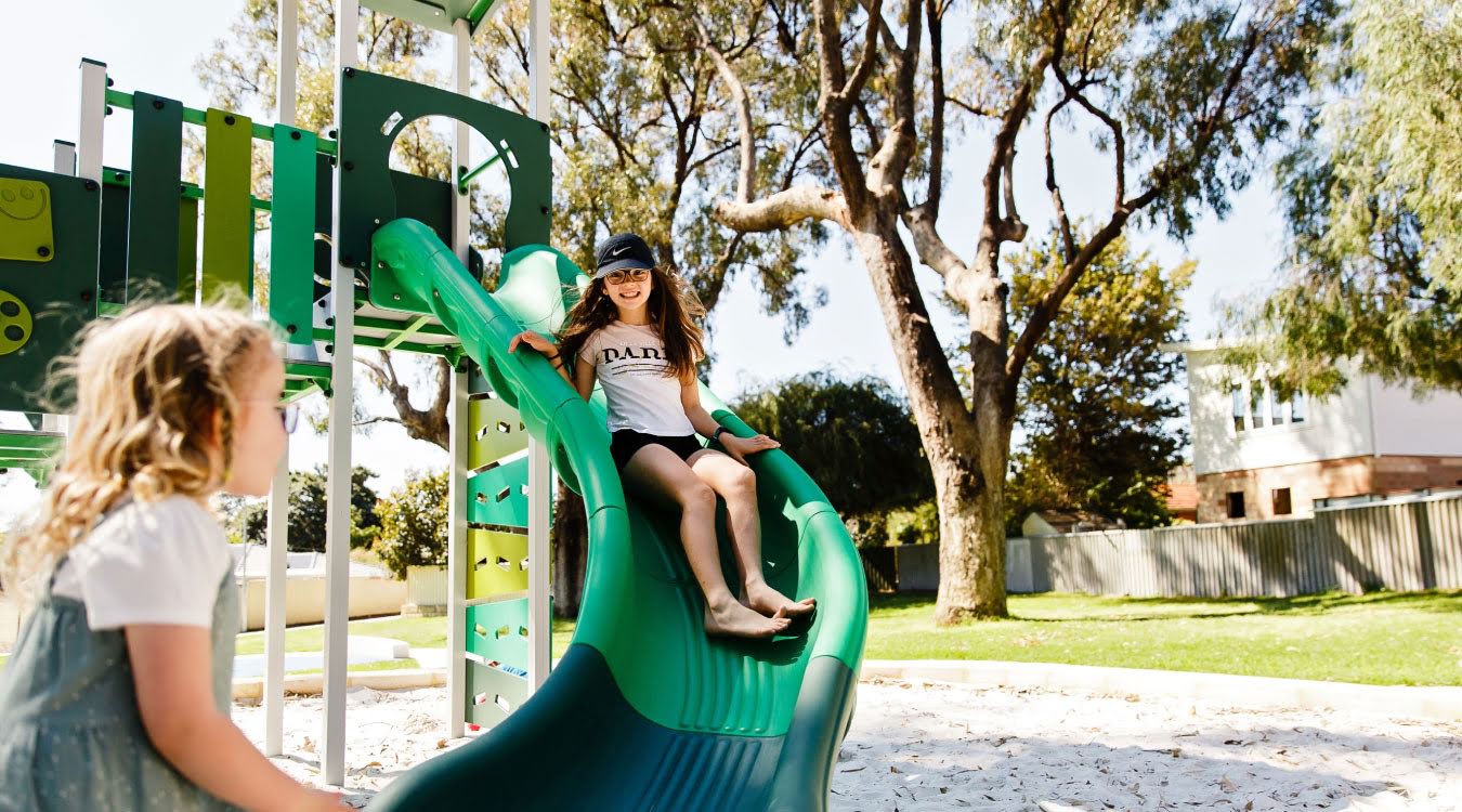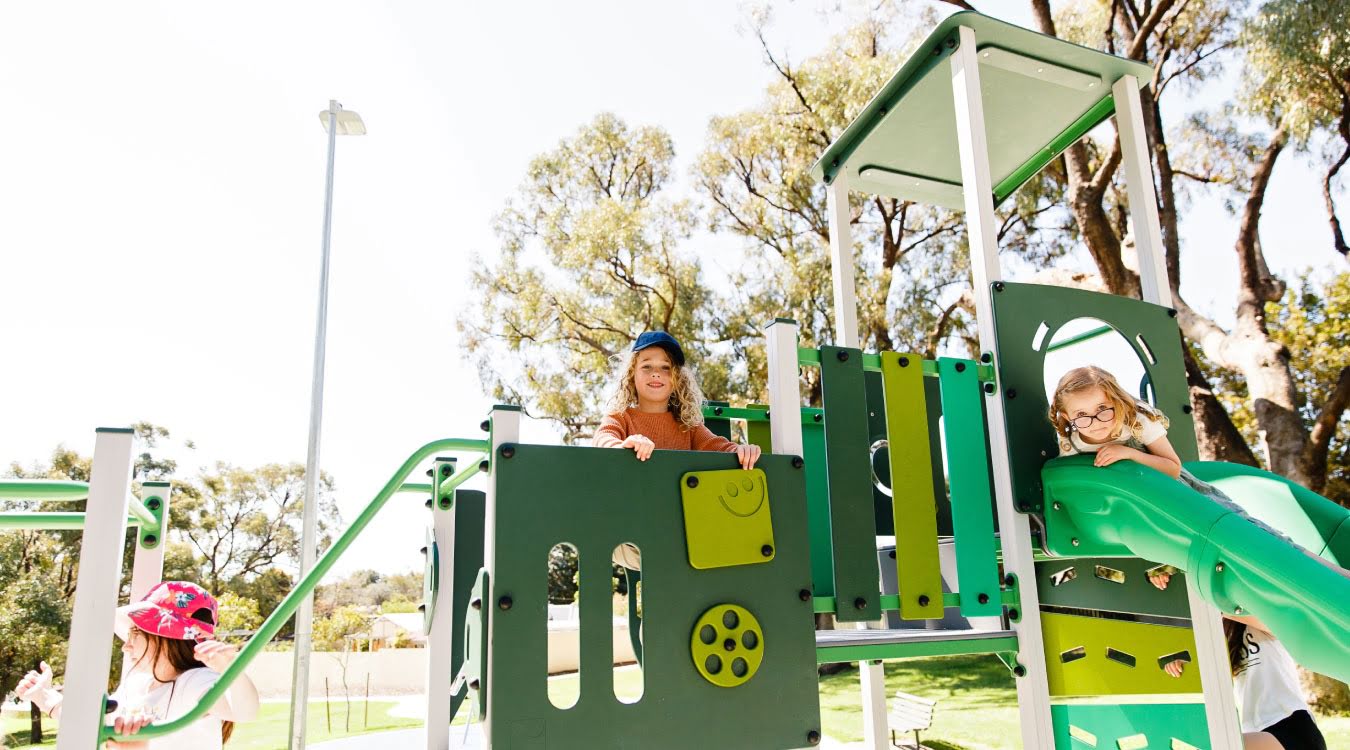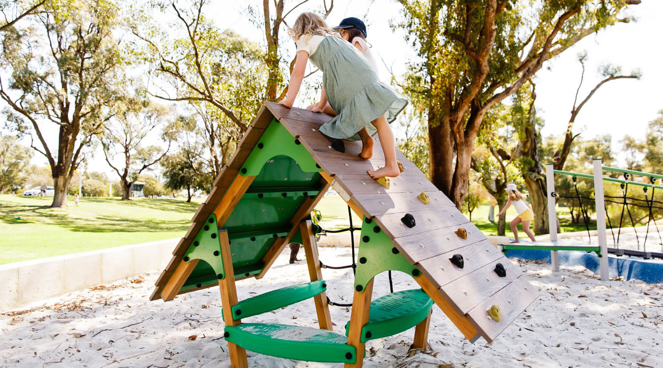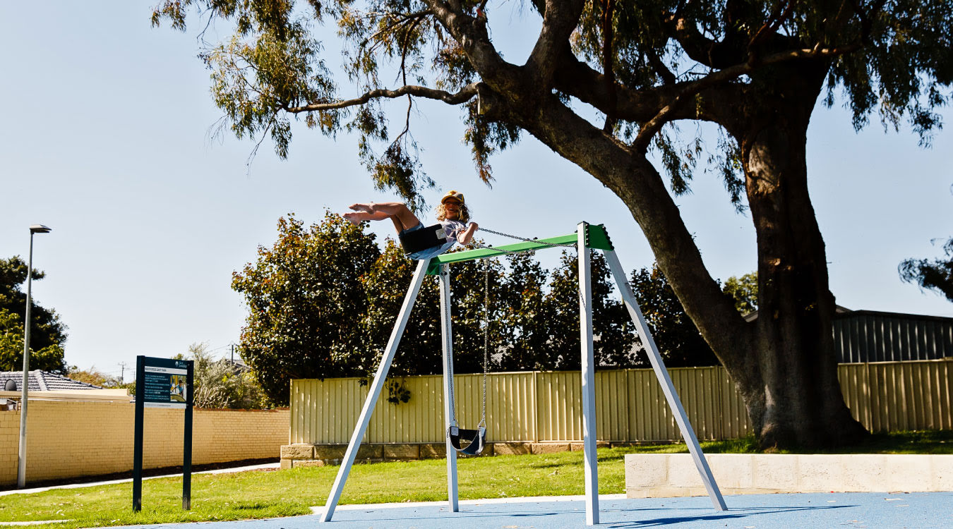 Nestled amongst beautiful leafy trees this playspace provides all the classic play opportunities in a nature setting. There’s something for all ages and abilities, a double swing in the shade of a mighty tree sits to the side whilst a vibrantly green Play Park unit with monkey bars takes centre stage and for the littlies a handy balance bridge takes you to the timber play hut and bike rocker.